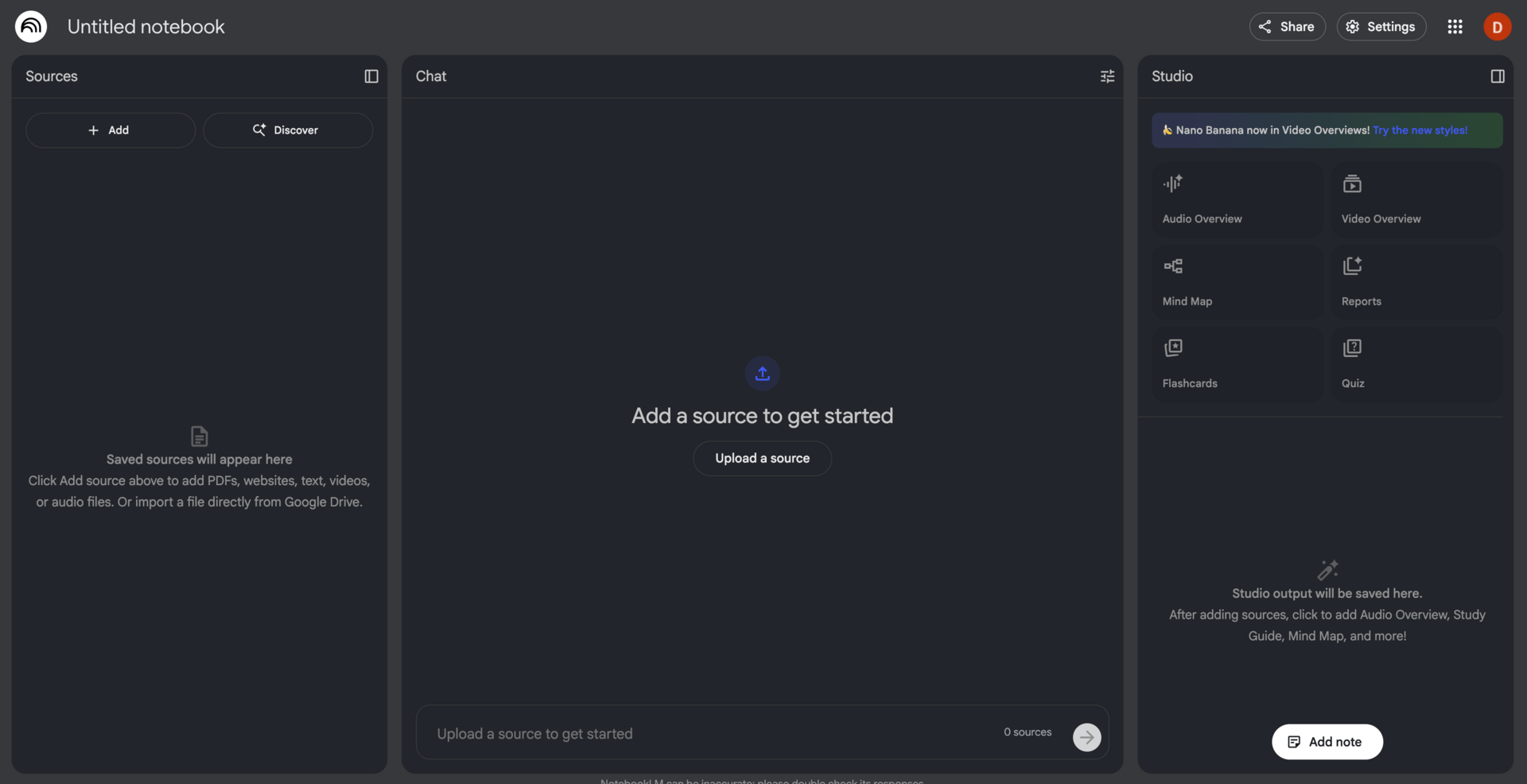 The 3-panel workspace in NotebookLM that makes it easy to collaborate with others.